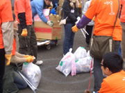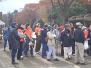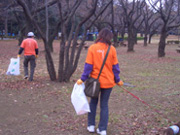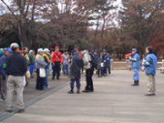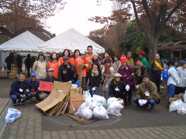 非常に寒い1日で、早朝の気温よりも時間が経つにつれて気温が下がっているとのラジオ情報…どうりで寒いわけだ。とにかくジッとはしていられない寒さ。しかし、そんな寒さにも関わらず代々木公園管理事務所の方や、東京都職員の方、ガーディアン・エンジェルズの方、一般ボランティアの方々など、噴水前の集合場所には推定約80人が集まりました。いくつかの班に分かれて、おそうじすることになりました。私達A−1チームは南門から原宿門にかけてのごみ拾い。他のチームの方々は落書きを消す作業等もされていたようです。